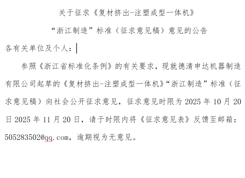關(guān)于征求《復材擠出-注塑成型一體機》 “浙江制造”標準(征求意見稿)意見的公告